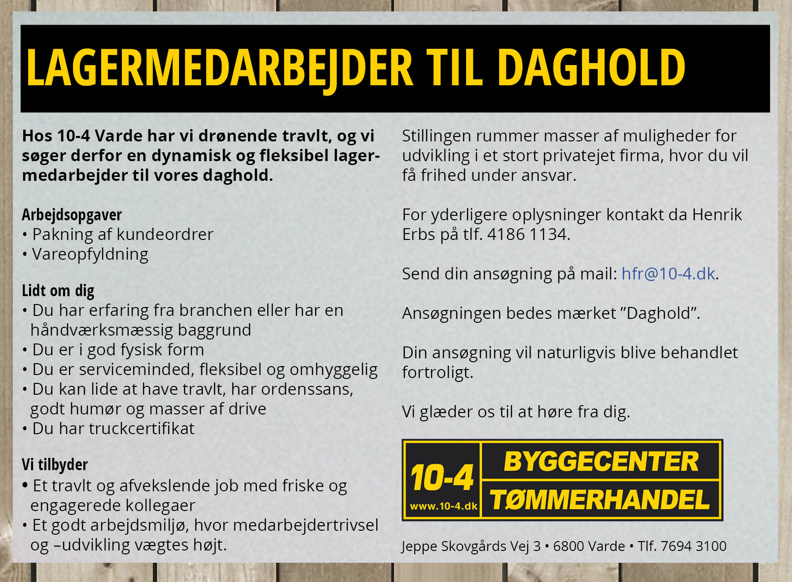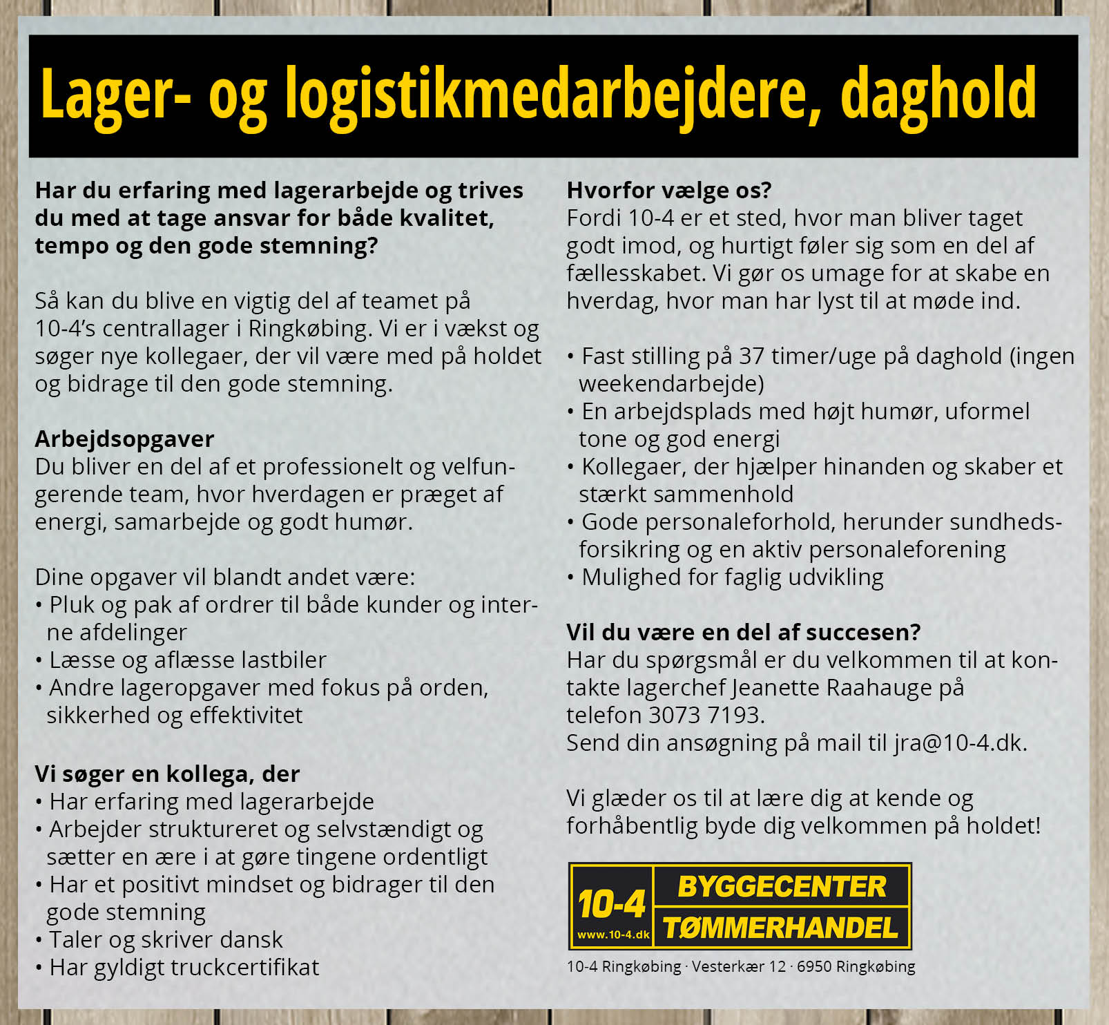 Hos 10-4 Byggecenter og Tømmerhandel tilbyder vi et arbejdsmiljø med gode kollegaer og en uformel atmosfære. Vi søger løbende dygtige medarbejdere, der ønsker at blive en del af vores team. Vores virksomhed lægger vægt på at skabe en positiv arbejdsplads med mulighed for personlig og faglig udvikling. Uanset om du er nyuddannet eller har mange års erfaring, kan du finde spændende karrieremuligheder hos os. Besøg vores side for at se de aktuelle ledige stillinger og bliv en del af 10-4 familien.